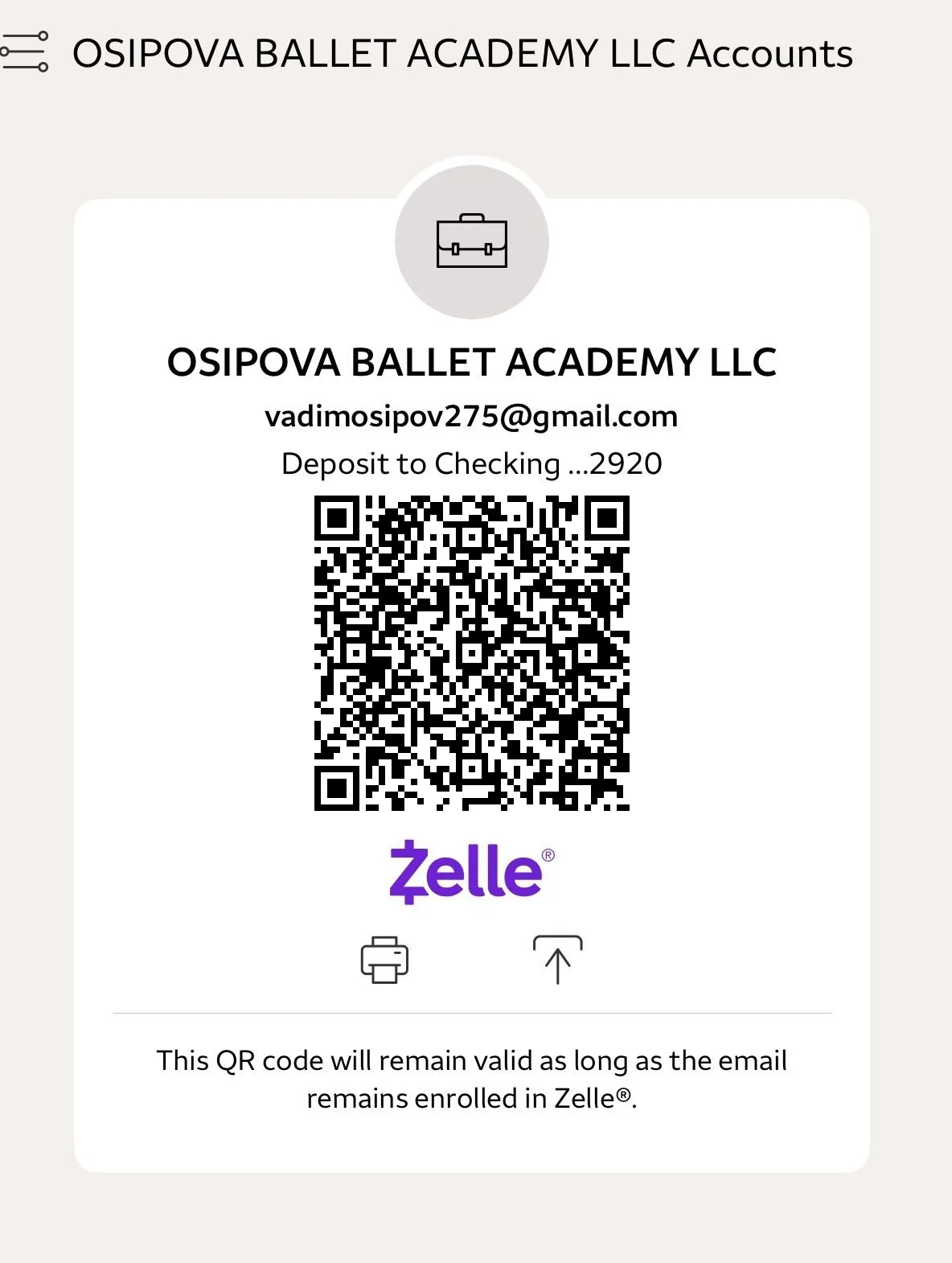 For tuition related fees (monthly, bi-yearly, yearly tuition, registration fee, master classes, intensives) please pay to Osipova Ballet Academy.