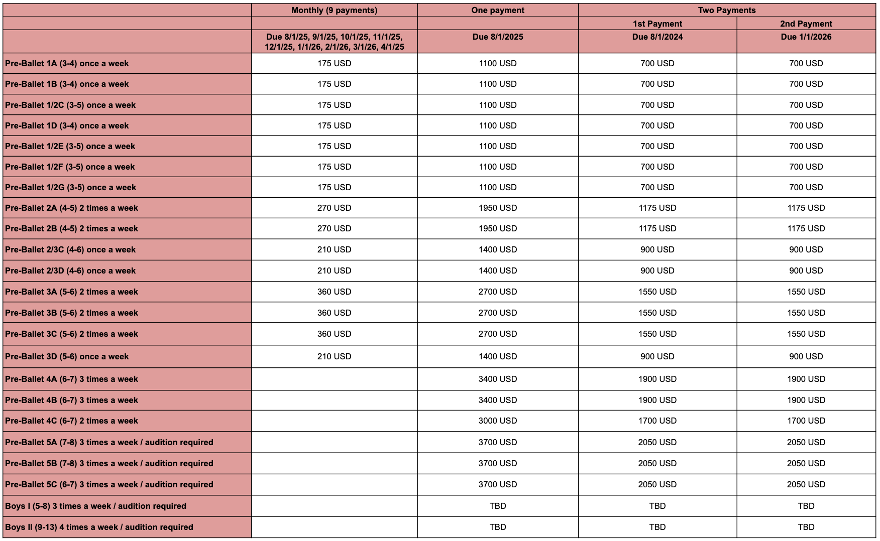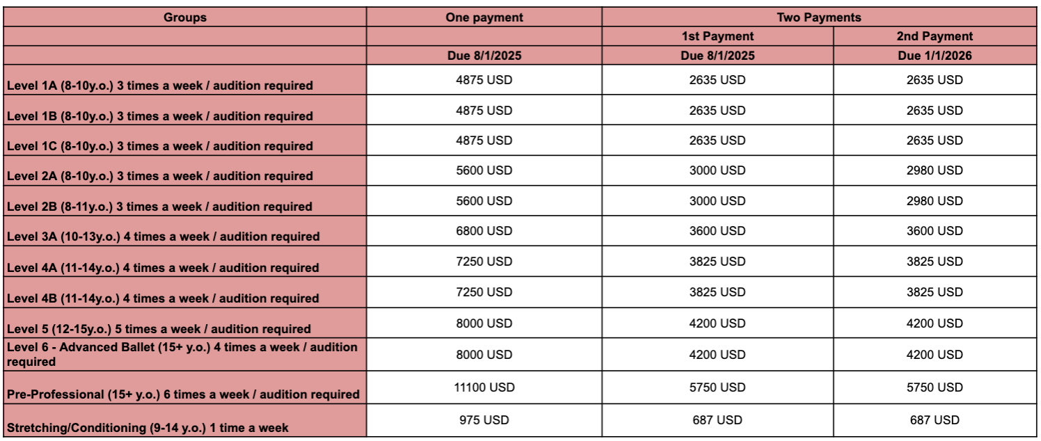 Osipova Ballet Academy 2025-2026 school year runs from September 2, 2025 to May 30, 2026. The tuition rates listed, for 2025-2026, reflect the total number of classes attended per week by all students averaged over the period. Tuition is ALWAYS the same regardless of the number of classes in the month.